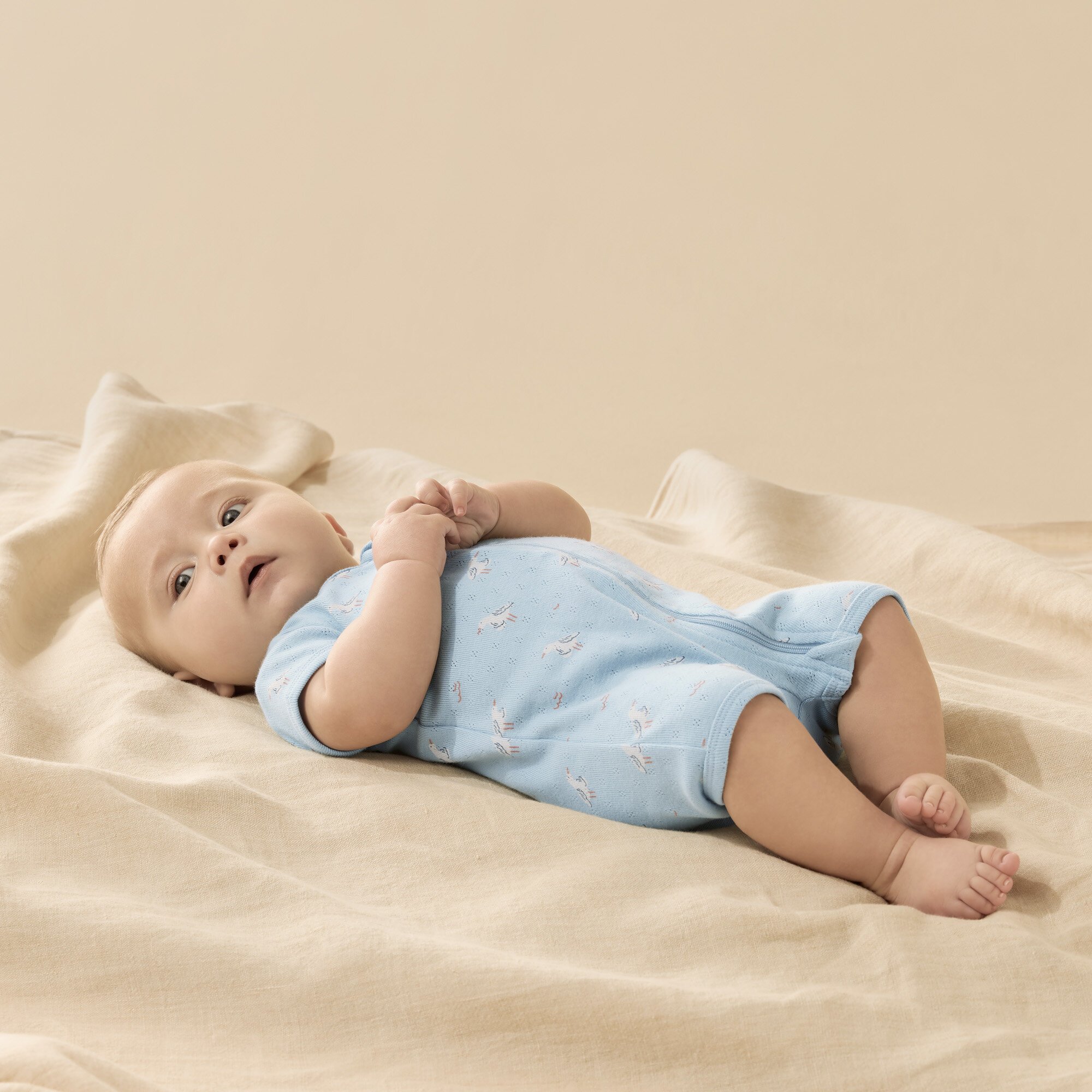 Key Features: Round neckline with concealed zipper for safety. Short sleeved. One-way zip closure for easy changes. Made from GOTS-certified organic cotton. Sustainably produced. Packaged in a bio-degradable bag.